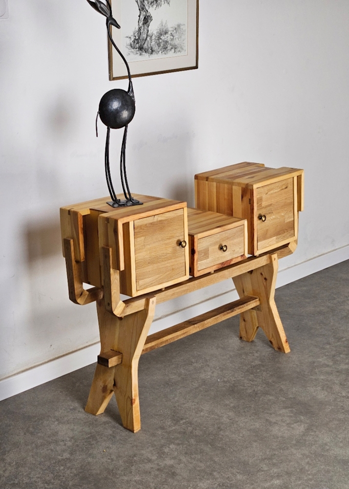 שידה / קונסולה הבנויה כקומפוזיציה של שלוש יחידות 'מרחפות', הנשענות על שלד קונסטרוקטיבי גלוי . מתאימה לחלל כניסה, לסלון ולחדר שינה . משלבת אחסון ופיסול בקו נקי וחומרי.