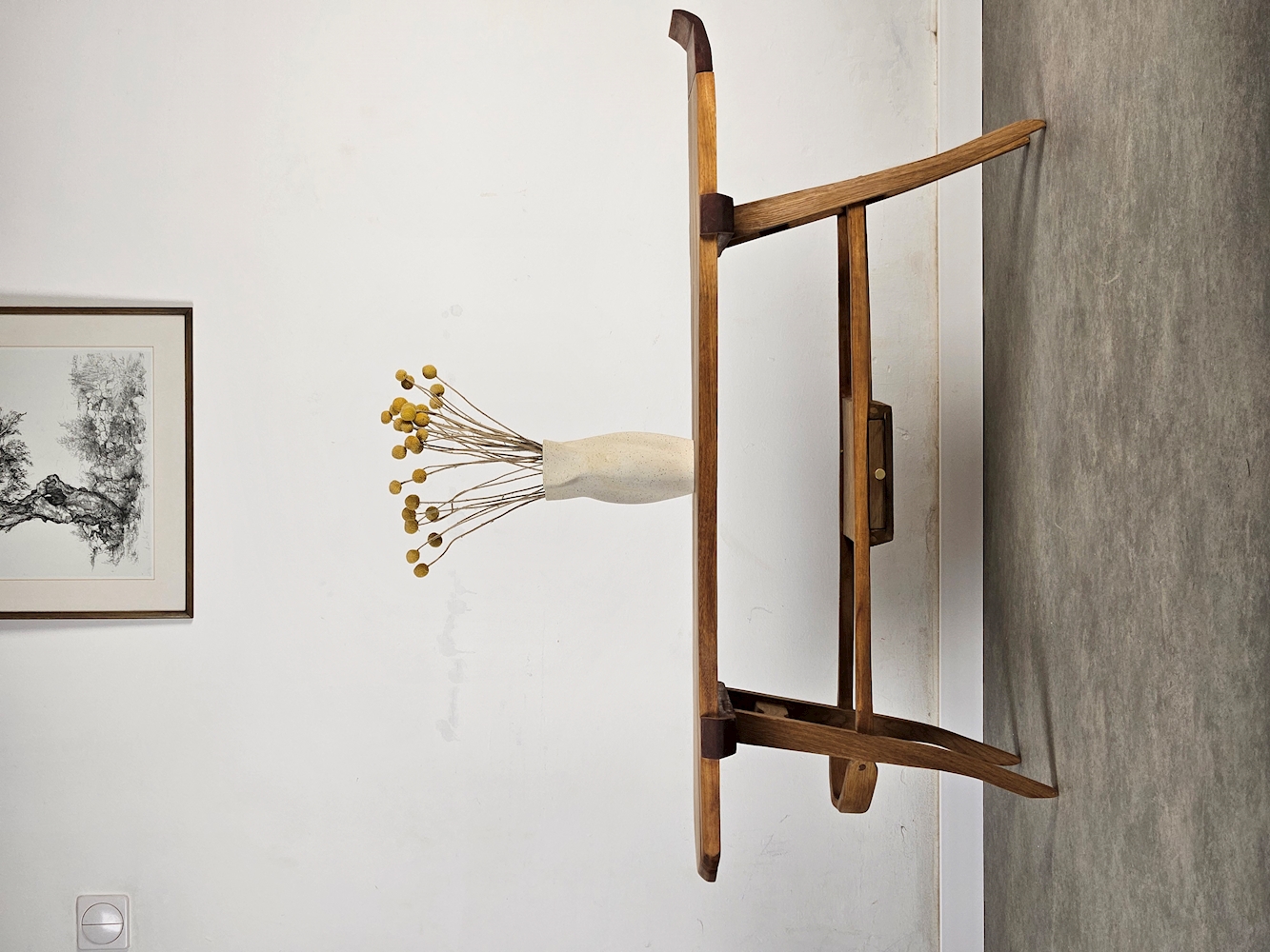 בין שולחן קפה לשולחן הגשה . רגליים פיסוליות נושאות פלטת עץ גושנית . הקצוות הלא מעובדים שומרים על קו העץ המקורי . העיטורים ה'יצוקים' בפלטה מדגישים את תנועת החומר במקביל לקוי המתאר של הרגליים .